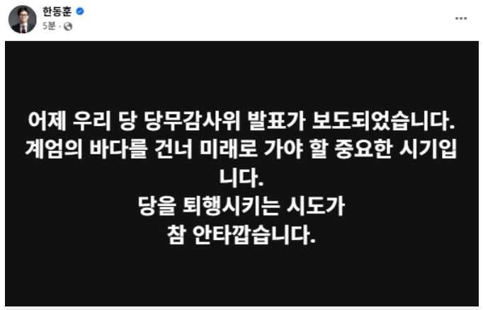 한동훈 전 국민의힘 대표가 국민의힘 당무감사위원회에서 28일 '당원 게시판 댓글 논란' 조사에 착수하겠다고 하자 입장을 내놓았다.한 전 대표는 29일 오전 10시 53분 자신의 페이스북에서 "어제 우리 당 당무감사위 발표가 보도됐다. 계엄의 바다를 건너 미래로 가야 할 중요한 시기이다. 당을 퇴행시키는 시도가 참 안타깝다