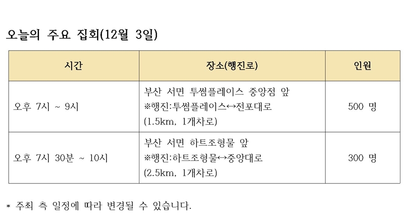 부산경찰청이 제공하는 [오늘의 집회]···3일 오후 부산서면 투썸플레이스 중앙점 앞·서면 하트조형물 앞