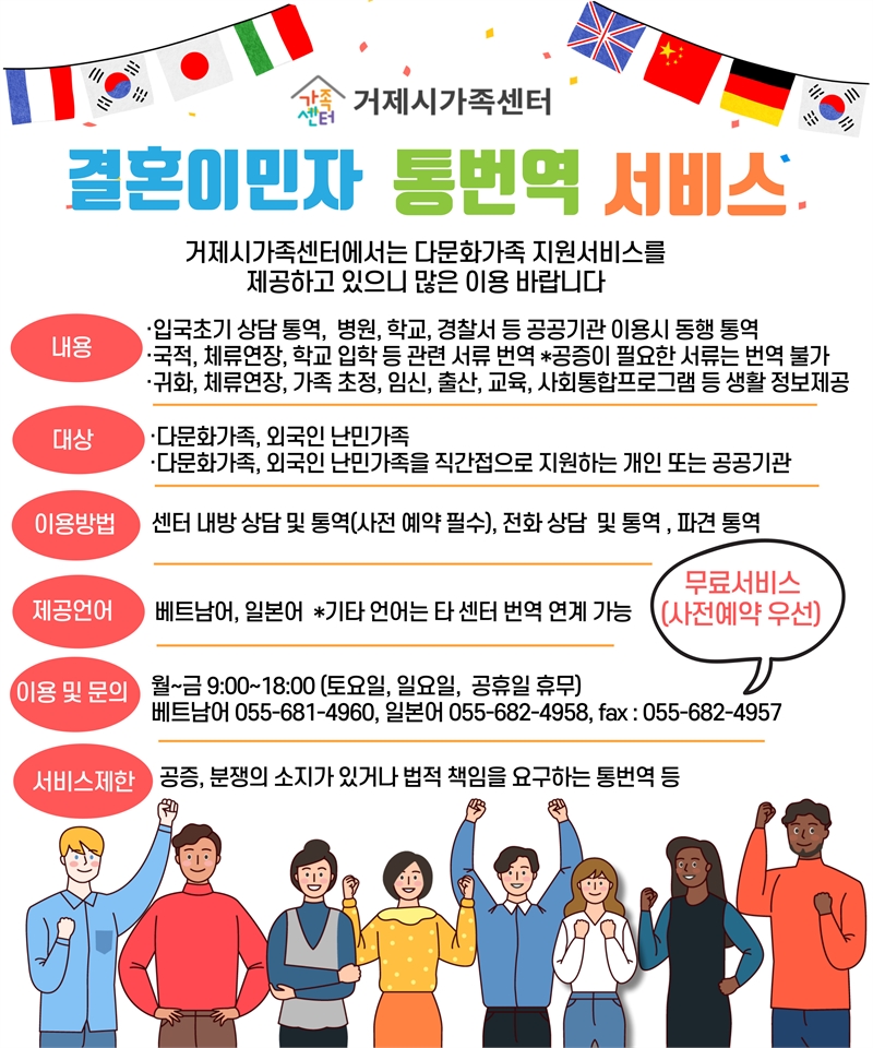 경남 거제시가족센터는 한국어가 서툰 결혼이민자의 일상생활 의사소통을 돕기 위해 무료 통·번역 서비스를 상시 운영하고 있다.통·번역 서비스는 단순한 언어 통역을 넘어 귀화, 건강보험, 양육, 가족 초청, 임신·출산 등 다양한 생활 분야에 필요한 정보와 상담을 함께 제공한다. 특히 행정기관, 의료기관, 학교 등 공공기관 이용