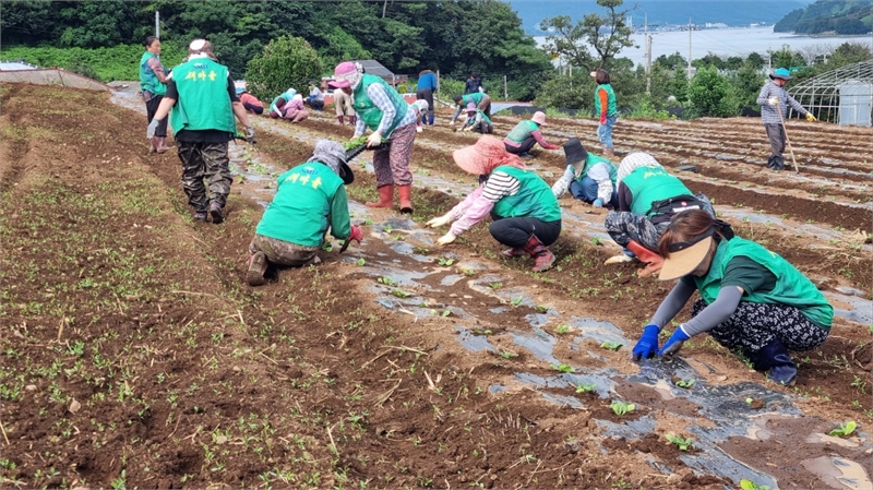 경남 남해군 창선면 새마을협의회·부녀회는 지난 18일 상신마을 휴경지에서 ‘사랑의 김장 담그기’ 행사에 사용할 배추 모종을 심었다.이날 행사에는 창선면 새마을협의회·부녀회 40여 명이 참여해 퇴비 살포와 밭갈이 작업을 마친 밭에 배추 모종 2500여 주와 무, 파 등의 부재료도 함께 심었다. 이날 심은 배추는 11월에 수