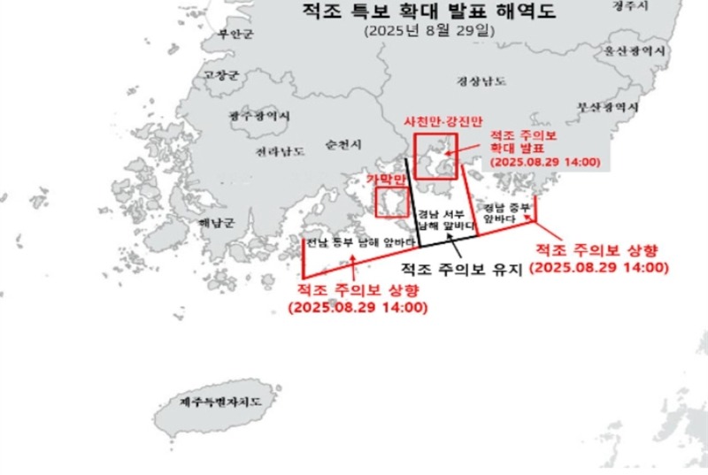경남 남해·하동군 해역에서 발생한 적조 피해가 가두리양식장이 밀집한 사천·통영·거제 등 다른 시군 해역으로 확산하고 있다.경남에는 9월 들어서도 여전히 30도가 넘는 폭염이 지속되면서 수온이 적조생물 성장에 적합한 24~27도를 보여 적조가 확산되고 있다. 지난달 말 적조주의보 발령 후 진해만을 제외한 경남 전 연안에 적