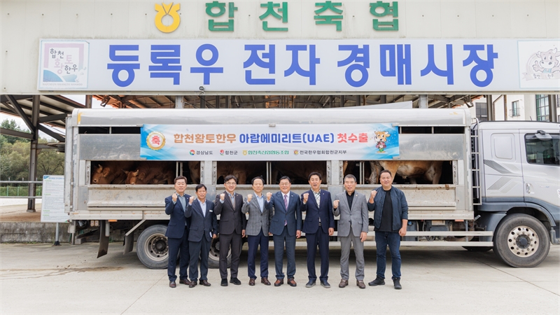경남 합천군은 22일 합천 한우경매시장에서 합천황토한우의 아랍에미리트(UAE) 첫 수출 출하식을 가졌다.이번 출하는 합천황토한우가 국내를 넘어 중동시장에 본격 진출하는 계기로 평가된다. 출하식에는 경남도, 합천군, 합천축협, 한우협회 및 한우농가 등 10여 명이 참석했다. 이번 수출은 총 8두(합천축협 생축장 6두, 한우