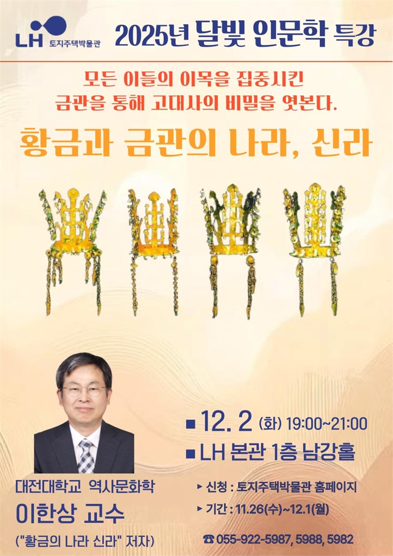 한국토지주택공사(LH)는 오는 12월 2일 '황금과 금관의 나라, 신라'를 주제로 명사 초청 특강을 개최한다.올해 네 번째 특강인 이번 강연에서는 이한상 대전대 교수가 최근 APEC 경주 정상회의에서 화제가 된 ‘금관’을 매개로 신라의 장신구와 금속공예 등 고대 역사와 문화의 비밀을 살펴볼 예정이다. 관심 있는 시민 누구