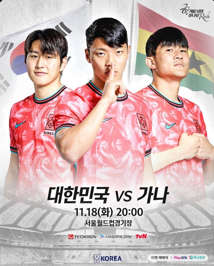 한국 축구대표팀이 18일 오후 8시 상암동 서울월드컵경기장에서 아프리카 복병 가나와 올해 마지막 대표팀 평가전을 갖는다.2022년 카타르월드컵 조별 경기에서 2-3으로 패배한 이후 첫 재대결이자 2026 북중미월드컵 조 편성 '포트2' 확정에 영향을 줄 수 있는 경기다. 중계는 TV조선과 tvN, 쿠팡플레이에서 한다. 한