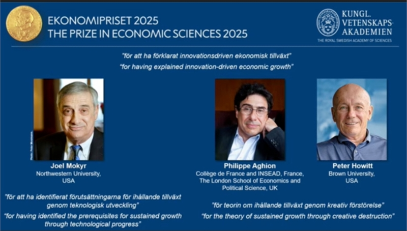 스웨덴 왕립과학원(한림원) 노벨위원회는 13일(현지 시각) 올해 노벨 경제학상 수상자로 혁신 중심의 경제성장을 창조적 파괴 개념으로 설파해온 3명의 학자를 공동수상자로 선정 발표했다.수상자인 조엘 모키어(79·네델란드 출신) 박사는 미 노스웨스턴 대학에서, 필립 아기옹(69·프랑스 출신) 박사는 콜레주 드 프랑스와 런던정