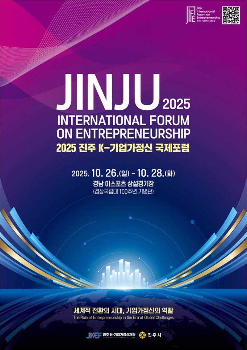 경남 진주시와 진주 K-기업가정신재단은 오는 10월 26~28일 경상국립대 100주년 기념관(경남 이스포츠경기장) 등 진주시 일원에서 '2025 진주 K-기업가정신 국제포럼'을 개최한다고 밝혔다.이번 포럼은 ‘세계적 전환의 시대, 기업가정신의 역할’을 주제로 진주 K-기업가정신 국제포럼 조직위원회에서 주관하며, 글로벌 행