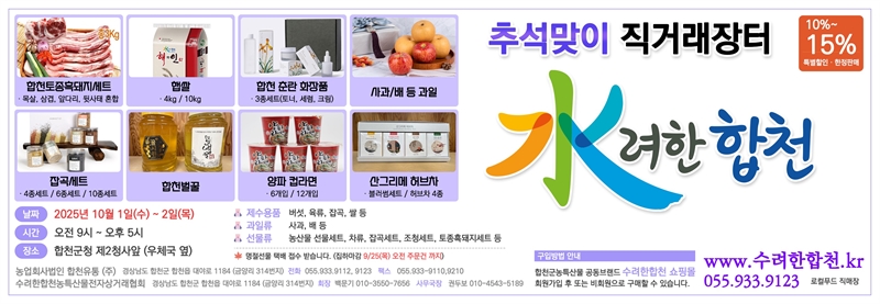 경남 합천군은 2025년 한가위를 맞아 10월 1일(수)부터 2일(목)까지 이틀간 합천군청 제2청사 입구(합천우체국 옆)에서 ‘추석맞이 농·특산물 직거래장터’를 운영한다.이번 장터는 판로 확보에 어려움을 겪는 지역 농가를 지원하고, 군민과 소비자에게 합리적인 가격으로 제수용품과 명절 선물을 생산자 직거래 방식으로 제공하기