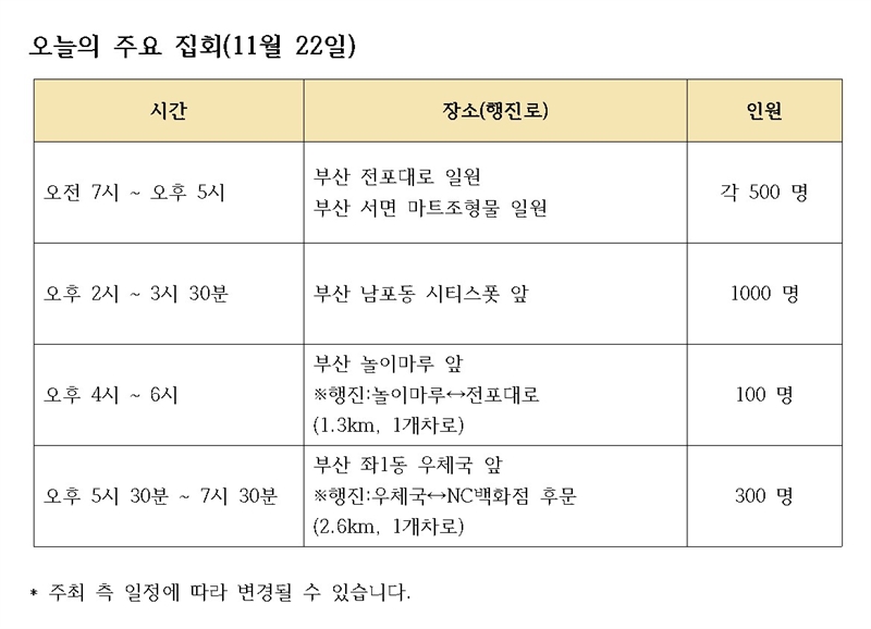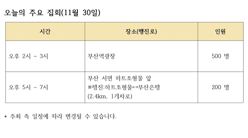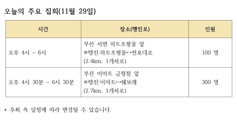 부산경찰청이 제공하는 [오늘의 집회]···29일 오후 부산 서면 하트조형물 앞·이마트 금정점 앞