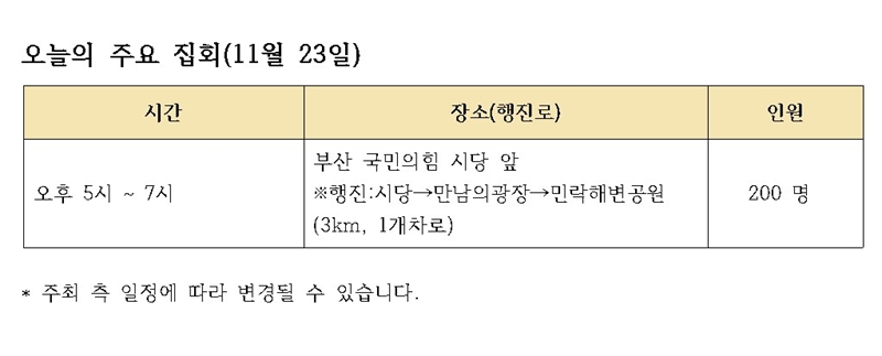 부산경찰청이 제공하는 [오늘의 집회]···23일 오후 부산 국민의힘 시당 앞