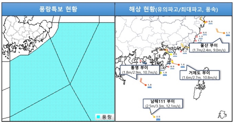 더경남뉴스는 부산기상청과 함께 부울경의 기상정보를 실시간으로 알립니다. 이는 농·어촌 기사를 중시하는 더경남뉴스가 농·어업인에게 도움을 드리기 위한 것으로, 다른 매체에선 시도하지 않은 틀입니다. ○ 풍랑 예비특보 - (25일 오전(07~12시)): 남해동부 안쪽 먼바다, 남해동부 바깥 먼바다 - (25일 오후(12~18