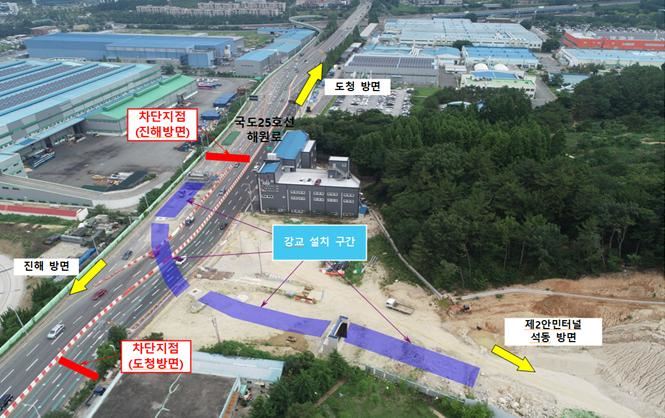 경남 창원시는 오는 18일 성산구에서 제2안민터널(진해구 방면)로 진입하기 위한 성주고가교 상판 설치를 위해 국도 25호선 신월자동차검사소 앞 도로를 전면차단 및 부분 통제한다고 16일 밝혔다.