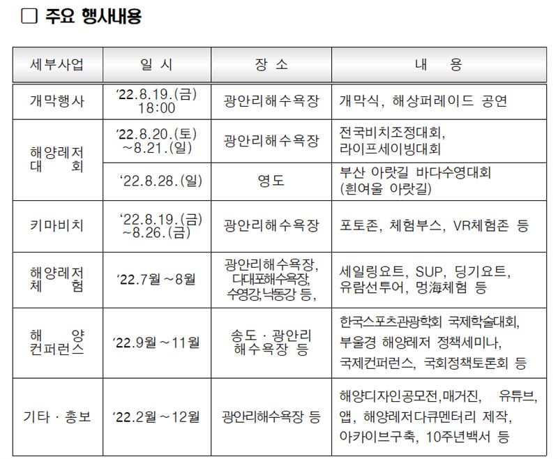 개막식에는 이병진 부산시 행정부시장, 송상근 해양수산부 차관 등이 참석하며, 서핑·요트·카약 등 해양레저 장비를 활용한 퍼레이드가 화려하게 펼쳐질 예정이다. 개막식 행사는 부산MBC와 유튜브로 생중계된다.