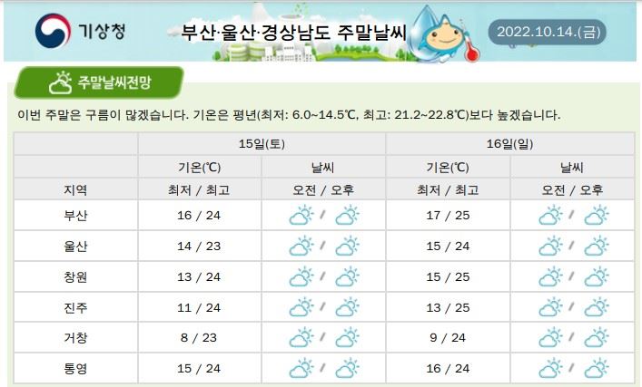 이번 주말(15~16일)에는 구름이 많고, 기온은 평년(최저 6~14.5도, 최고 21.2~22.8도)보다 높아 여행 등 야외 활동에 알맞겠다. 경남 진주 지방은 15일 최저 11도에서 최고 24도, 16일엔 13도에서 25도가 되겠다.