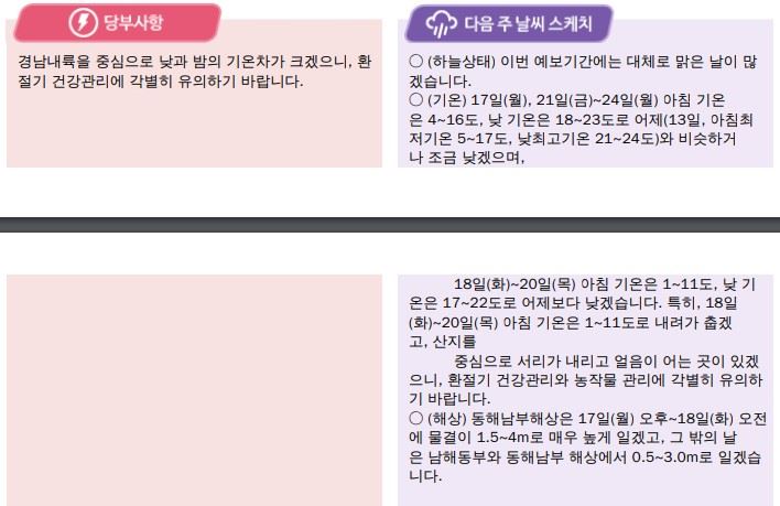 다음 주엔 부울경엔 기온이 조금 내려가겠다. 17일(월), 21(금)~24일(월)의 아침 최저기온은 4~16도, 낮 최고기온은 18~23도로 13일 아침 기온 5~17도, 낮 기온 21~24도와 비슷하거나 조금 낮겠다.