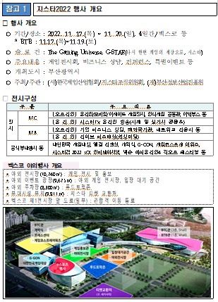 부산시는 오는 17일부터 20일까지 4일간 벡스코에서 국내 최대 게임전시회인 ‘지스타 2022’를 개최한다고 밝혔다.