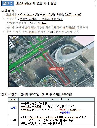 통제 기간은 지스타 기간 4일간 오전 9시부터 오후 6시까지이며, 센텀역 교차로에서 벡스코 정문 입구까지 6차선 도로를 양방향으로 전면 통제한다. 도로 통제에 따라 시내버스 307번이 벡스코 정류장에 정차하지 않고 우회해 운행한다.
