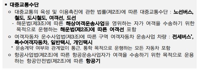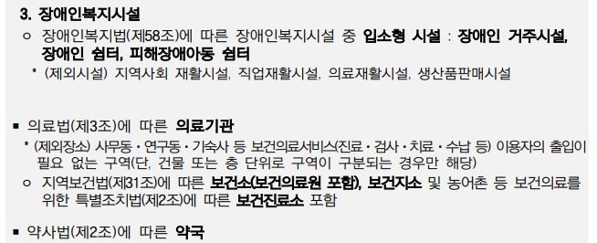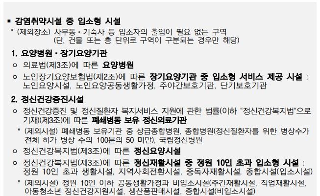 감염취약시설 중 입소형 시설은 요양병원·장기요양기관, 정신건강증진시설, 장애인복지시설이며, 대중교통수단은 노선버스, 철도, 도시철도, 여객선, 도선, 전세버스, 특수여객자동차, 택시, 항공기다.