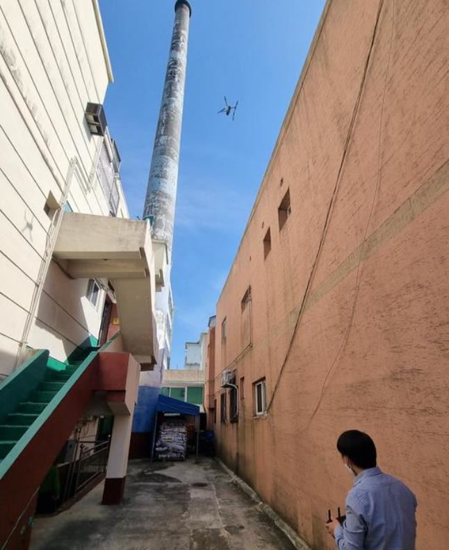 경남도 건축안전담당자가 드론을 이용해 목욕탕 노후 굴뚝의 상부를 촬영한 사진