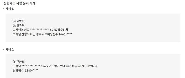 이 문자메시지는 신한카드뿐 아니라 삼성카드, 현대카드, KB국민카드, 우리카드, 롯데카드, 하나카드, BC카드 등에도 해당될 수 있어 휴대전화로 발송되는 '카드 발급'이나 '신고 내역'이란 문자메시지 속의 인터넷 주소(URL)를 절대 클릭하면 안 된다.
