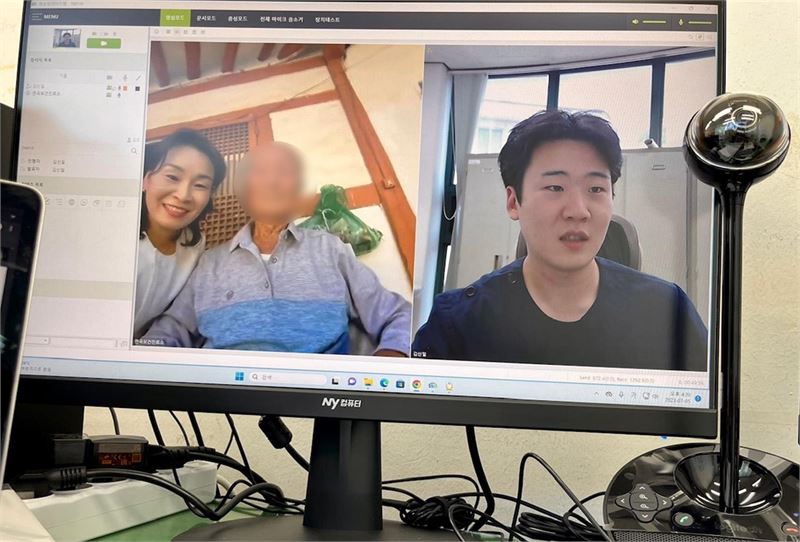 의료취약계층 어르신이 방문간호사와 함께 원격진료로 건강상담을 받고 있다. 남해군 제공