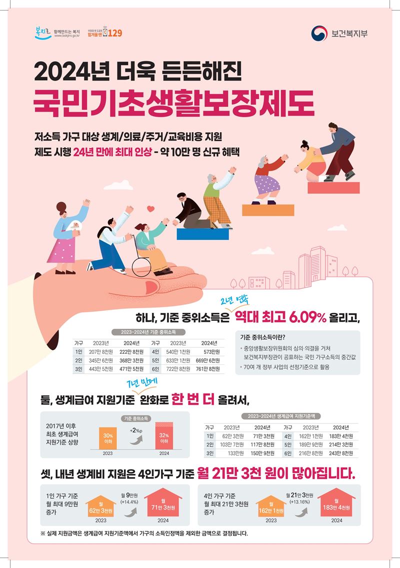 이번 중위소득 인상과 선정기준 확대는 국민기초생활보장제도가 시행된 지 24년 만에 최대폭이며, 복지 사각지대를 해소하고 기초생활보장제도의 사회 안전망 기능이 더욱 강화될 것으로 기대된다.
