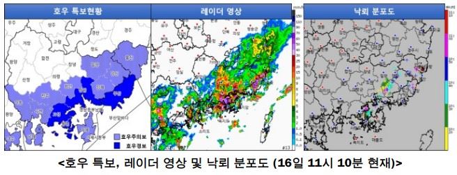○ 호우주의보: 울산, 경남(양산, 김해, 밀양, 함안, 진주, 하동, 사천, 거제, 남해)