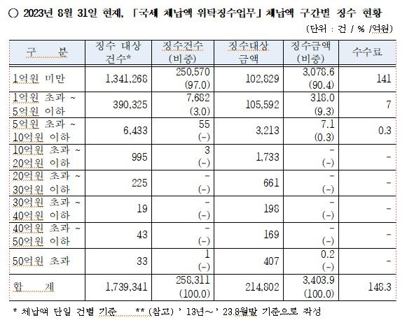 8월까지의 국세 체납 징수 실적(1.6%)을 금액 구간별로 보면 징수 건수로는, 1억 원 미만이 25만 570건(97.0%)으로 가장 많았으며 징수한 금액도 1억 원 미만이 3078억 6000만 원(90.4%)으 가장 많았다.