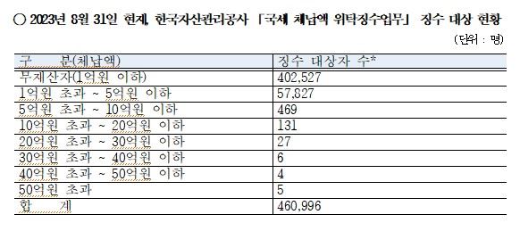 8월 현재 한국자산관리공사의 ‘국세 체납액 위탁징수업무’상 징수 대상자인 체납자를 살펴보면 ▲1억원 이하 40만 2527명(87.3%) ▲1억 원 초과 5억 원 이하 5만 7827명(12.5%) ▲5억 원 초과~10억 원 이하가 469명(0.1%) 등의 순이다.