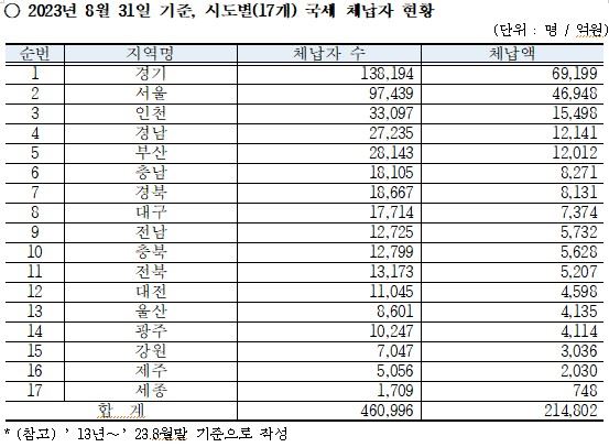 전국 시도별 국세 체납자를 살펴보면 경기도가 13만 8194명(30.0%, 체납액 6조 9199억 원)으로 가장 많았으며 서울시 9만 7439명(21.1%, 체납액 4조 6948억 원), 인천시 3만 3097명(7.2%, 체납액 1조 5498억 원) 등이었다.
