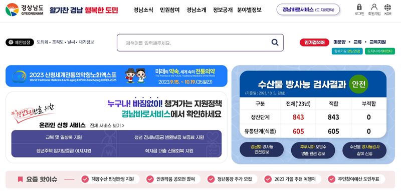 경남도는 5일 후쿠시마 방사능 오염수 2차 방류 개시에 따른 도민들의 불안 해소를 위해 경남도 방사능 안전정보’ 전용 웹서비스를 1개월간의 시범 운영을 마치고 도 홈페이지에 공개한다고 밝혔다.