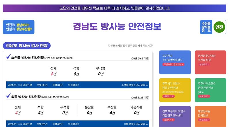웹 서비스는 ▲도내 생산 및 유통단계 수산물 방사능 검사결과 ▲수산물 방사능검사 도민참여 신청 ▲후쿠시마 오염수 방출 실시간 현황정보 등 관련 정보를 총괄해 경남도 홈페이지 메인화면에서 누구나 실시간으로 이용할 수 있도록 했다.