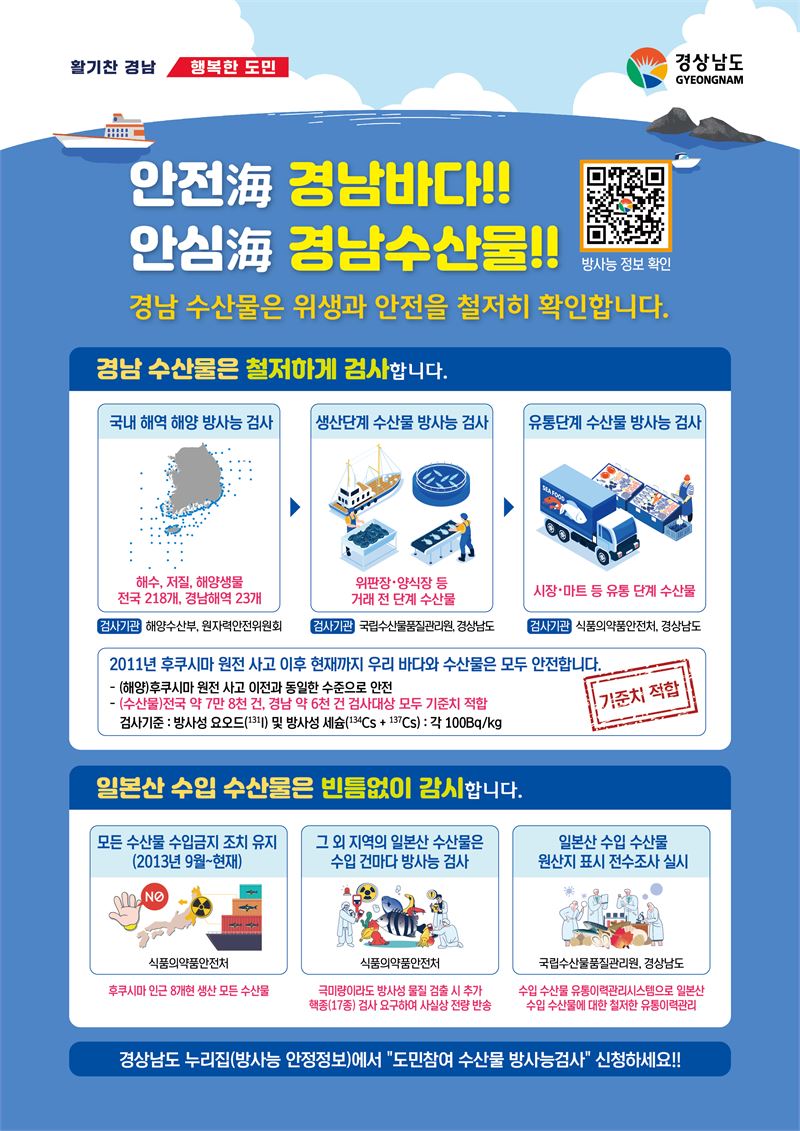 이와 함께 QR코드를 표시한 수산물 안전 홍보 전단지, 포스터를 제작해 수산시장, 횟집 등 수산물 취급업체에 배부해 도민들이 직접 보다 쉽게 방사능 검사결과 정보에 접근할 수 있도록 했다.
