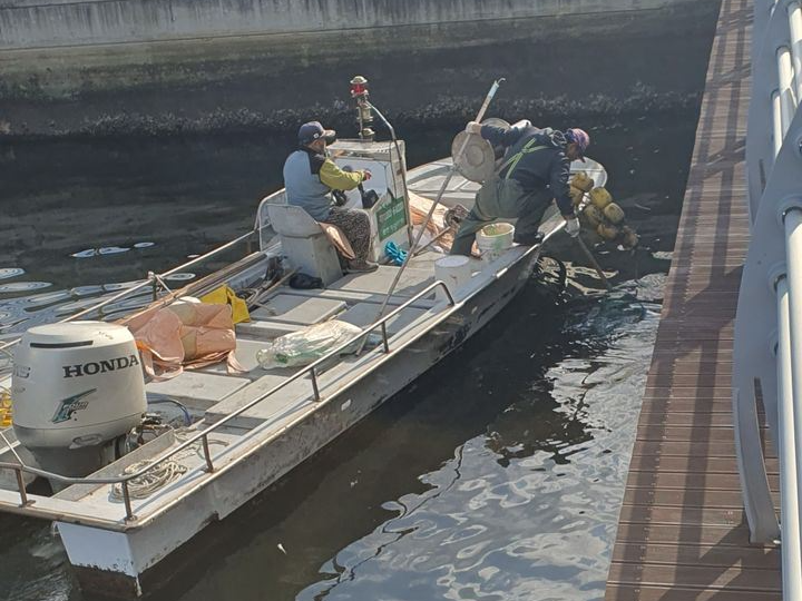 창원시와 마산해양신도시 시공사 HDC현대산업개발은 죽어 떠오른 정어리를 수거했다.