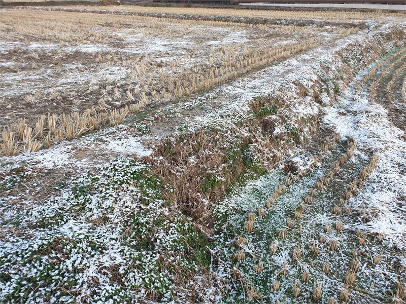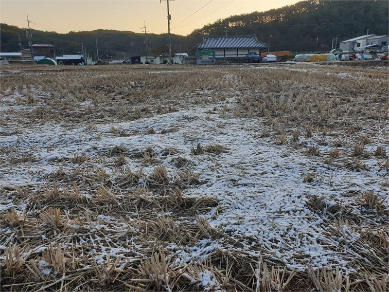 동네 가운데 논에 하얗게 눈이 내린 모습
