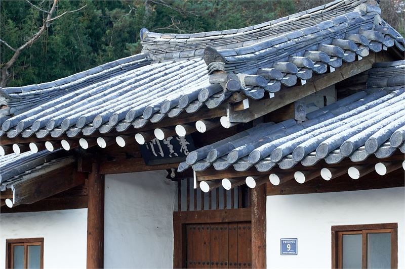 눈이 내려 하얗게 바뀐 기왓집 지붕