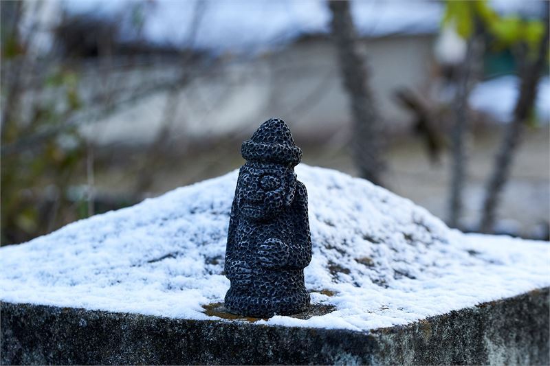 대문 기둥 위의 돌하루방과 하얀눈. 겨울 날씨가 온화한 제주에서 온 돌하루방이 홀로 추워보인다. 이상 정창현 기자