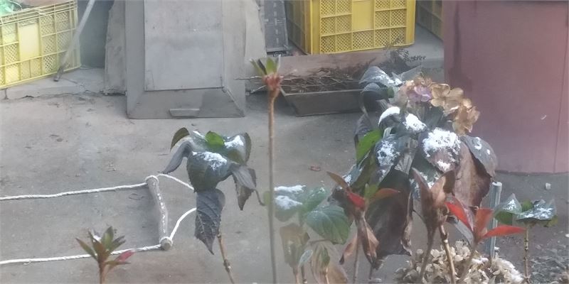 서리를 맞아 검게 변한 화단 이파리에도 흰눈이 점점이 자리하고 있다.