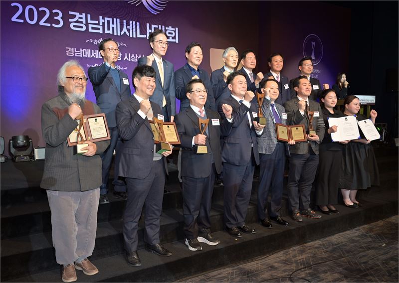 2023 경남메세나대회에서 시상을하고 단체 기념사진을 찍고 있다. 경남도 제공