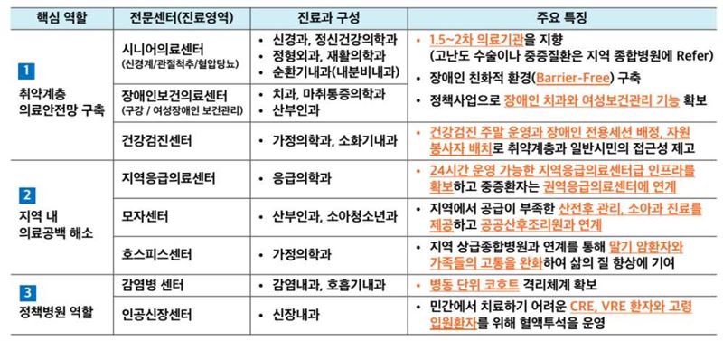 지역보건의료기관과 연계한 원격진료 수행, 전 병실 간호간병통합서비스 도입, 응급센터 운영 및 감염병센터의 환자분류 강화, 일반병실 감염병동 단계별 전환 시스템 도입 등 차별화 방안도 제시했다.