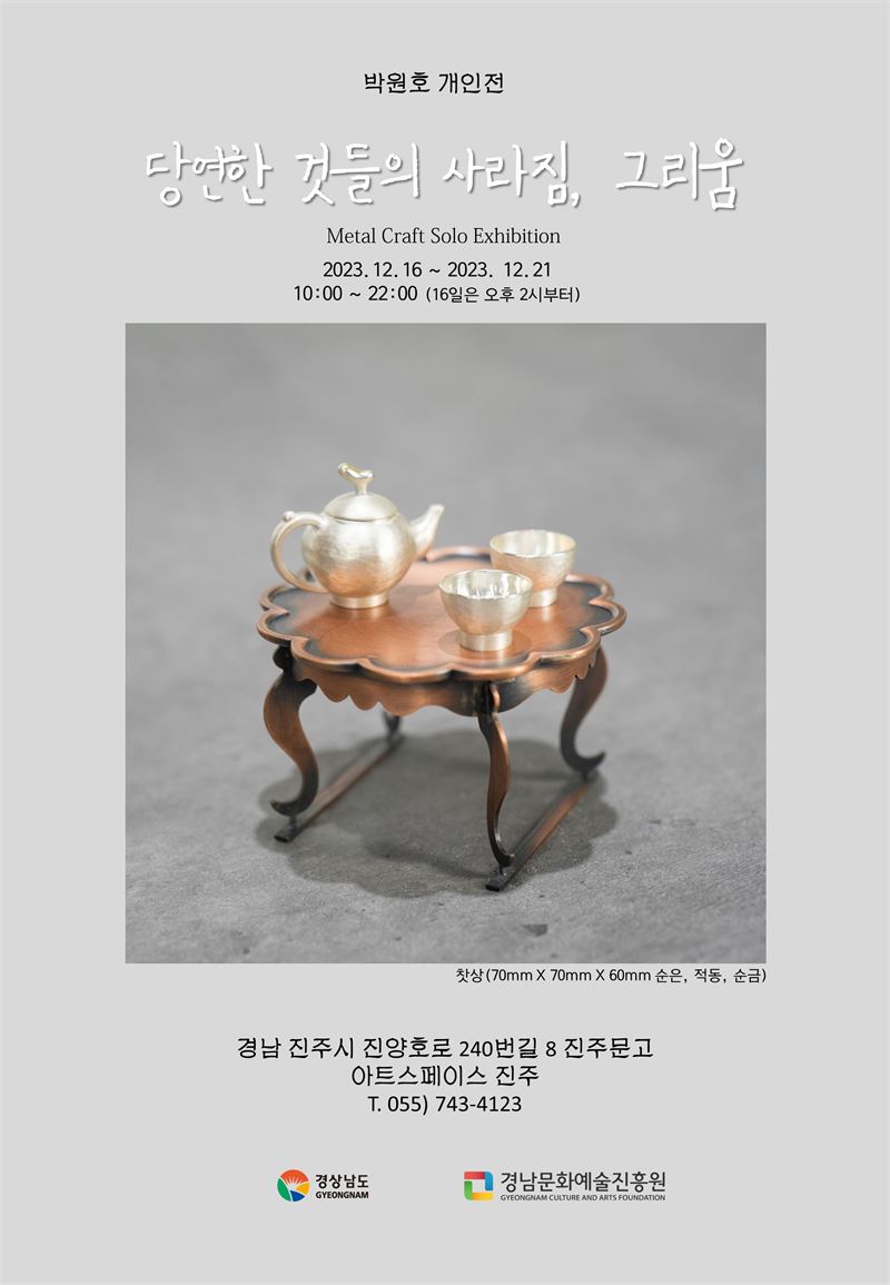 금속공예가 박원호 작가는 토요일인 오는 16일부터 경남 진주시 평거동에 있는 진주문고 복합문화공간 아트스페이스 진주에서 개인전 '당연한 것들의 사라짐, 그리움'을 개최한다.