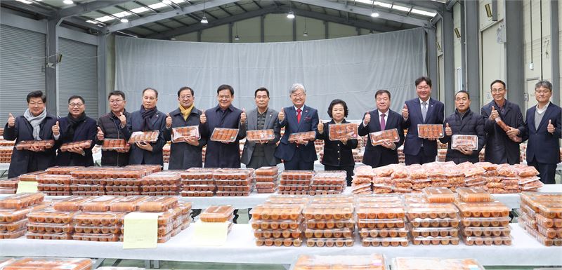 ‘지리산 산청곶감’ 출하 초매식 참석자들이 곶감을 들고 첫 출하를 축하하고 있다.
