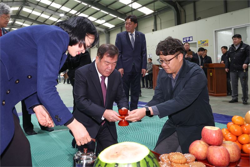 이승화 산청군수가 ‘지리산 산청곶감’ 출하 초매식에서 잔을 올리고 있다. 이상 산청군 제공