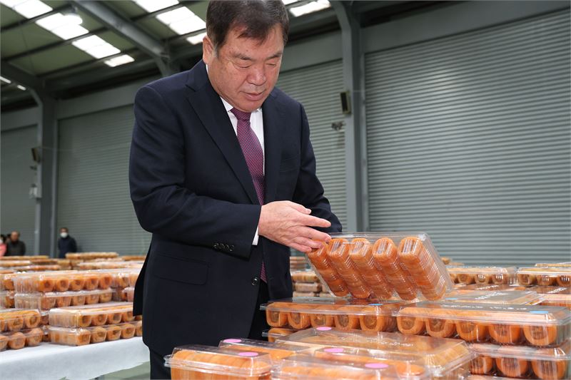 이승화 산청군수가 초매식에 출하된 '산청곶감'을 살펴보고 있다.