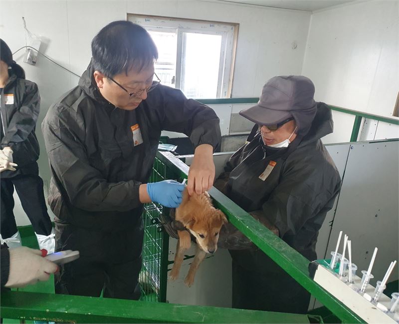 진주시수의사회 소속 수의사가 진주시 동물보호센터에서 반려견의 건강상태를 실피고 있다. 진주시 제공