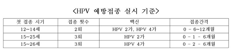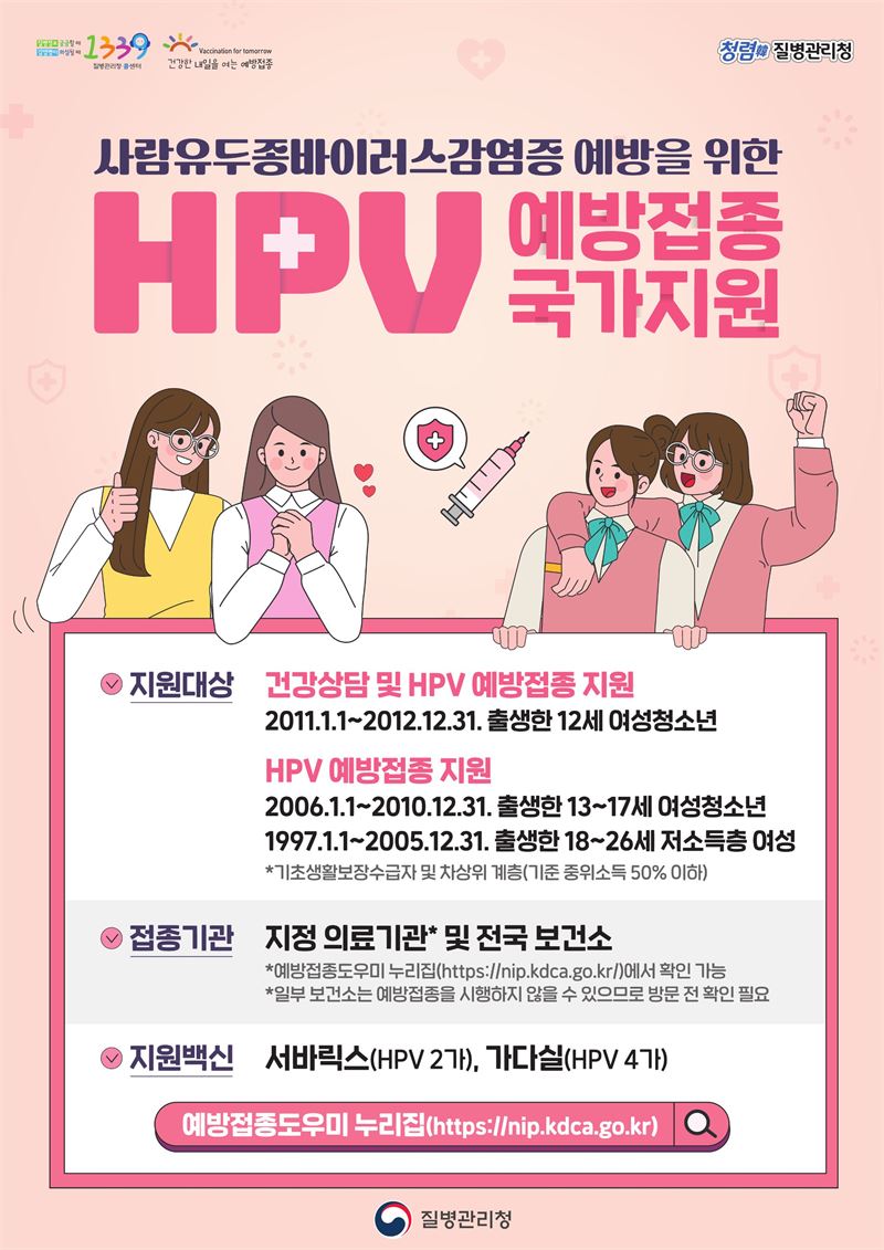 올해 HPV 국가예방접종지원사업 대상자는 ▲12~17세 여성청소년(2006년 1월 1일~ 2012년 12월 31일 출생자) ▲18~26세 저소득층 여성(1997년 1월 1일~2005년 1월 1일 출생자)이며 HPV 2가(서바릭스) 또는 HPV4가(가다실) 예방접종 비용을 지원하고 있다.