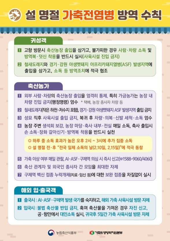 요즘 낮은 기온으로 소독 여건이 악화하고 고병원성 AI와 아프리카돼지열병이 발생하고 있다. 설 연휴에는 이동하는 귀성객과 해외를 찾는 여행객이 늘어 가축전염병의 전파 위험도가 증가한다.