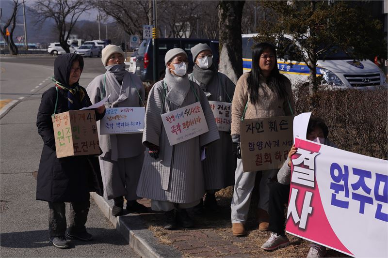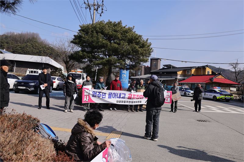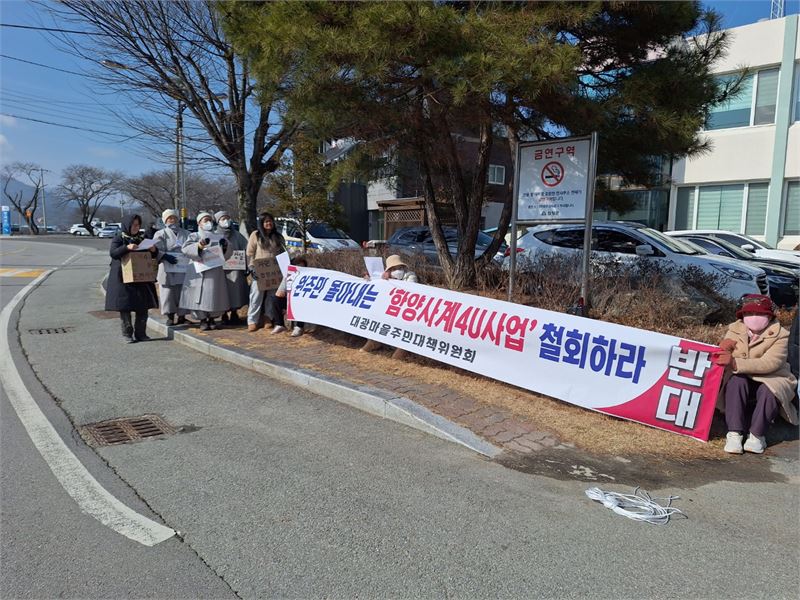경남 함양군 대광마을 부지 선정 백지화 대책위원회는 7일 마을 주민 등과 함께 함양군 병곡면사무소 앞에서 '함양사계4u' 사업에 대한 규탄 집회를 가졌다.