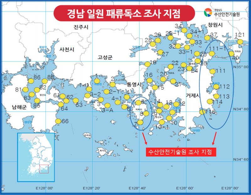 경남도 일원 패류독소 조사 지점. 이상 경남도