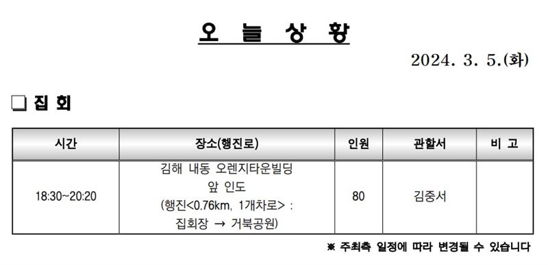 정책·정치·사회존 > 사회(사건사고&교통&노동환경) 경남경찰청이 제공하는 [오늘의 집회]···5일 오후 김해 내동 오렌지타운빌딩 앞 더경남뉴스 승인 2024.03.05 10:19 | 최종 수정 2024.03.05 23:21 0 더경남뉴스는 경남경찰청이 제공하는 경남 도내에서 예정된 집회 내용을 주기적으로 전합니다. 각종 집회가 전하는 메시지도 있지만, 교통 정체 등 주민 생활에 직접 관계가 있기 때문입니다. ※알립니다. 그동안 경남도경찰청의 사정으로 [오늘의 집회]가 중단됐었습니다. 이 코너에 대한 독자들의 관심은 꽤 높았습니다. 차량 운전자들이 교통 정체 등에 민감하기 때문입니다. 다시 제공하는 이 코너에 대한 많은 관심과 애독을 바랍니다. 7 0 더경남뉴스 더경남뉴스 thegnnews@naver.com 더경남뉴스의 기사 더보기 저작권자 ⓒ 더경남뉴스