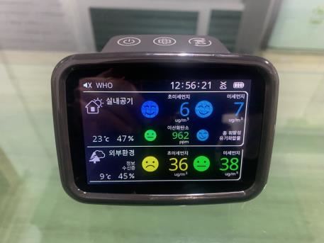 미세먼지 간이측정기는 초미세먼지, 미세먼지, 이산화탄소, 총 휘발성유기화합물을 실시간으로 측정할 수 있는 기기로 환경부 성능인증 1등급 제품이다.